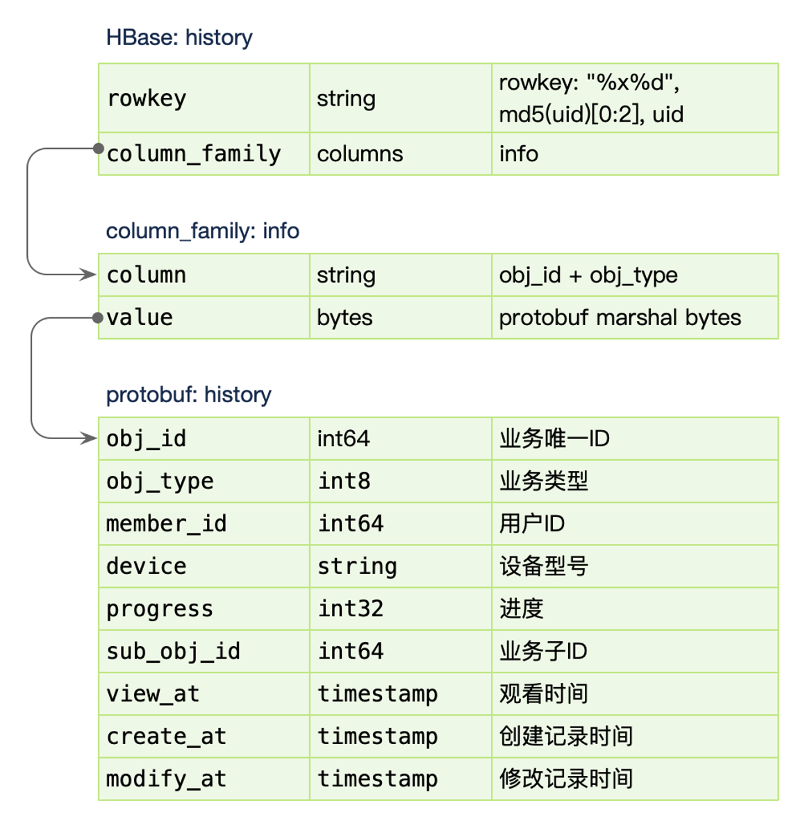 - 对于 column_family:info,存储一个列 obj_id + obj_type,例如 稿件业务:1、稿件ID: 100**,**100_1 作为列名,对于 value 使用 protobuf 序列化一个结构体接入。所以只需要单次更新 kv store。另外我们使用 HBase TTL 的能力,只需要保存90天的用户数据即可。(删除同理)