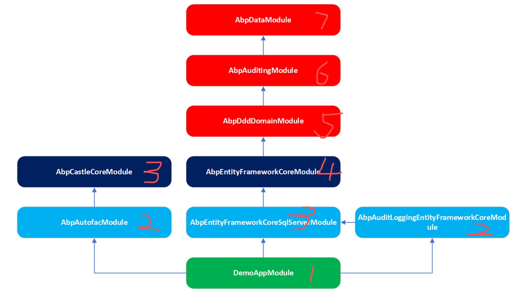 ABP vNext 通过 [DependsOn] 特性来管理模块间的依赖关系。框架会使用拓扑排序算法或树形结构后序遍历算法来分析这些依赖,确保所有模块按照正确的顺序加载和初始化——被依赖的模块总是先于依赖它的模块执行。