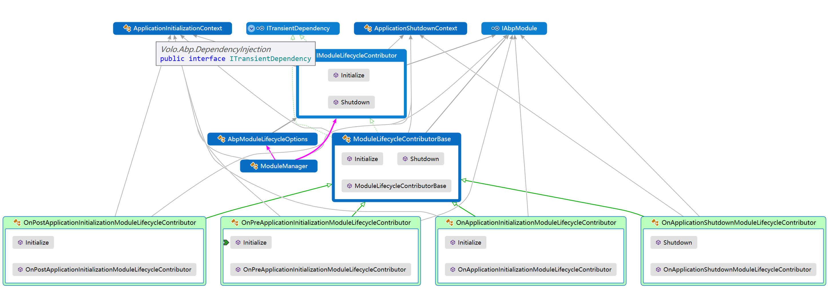 - 接口IModuleLifecycleContributor,定义了Initialize和Shutdown方法约束