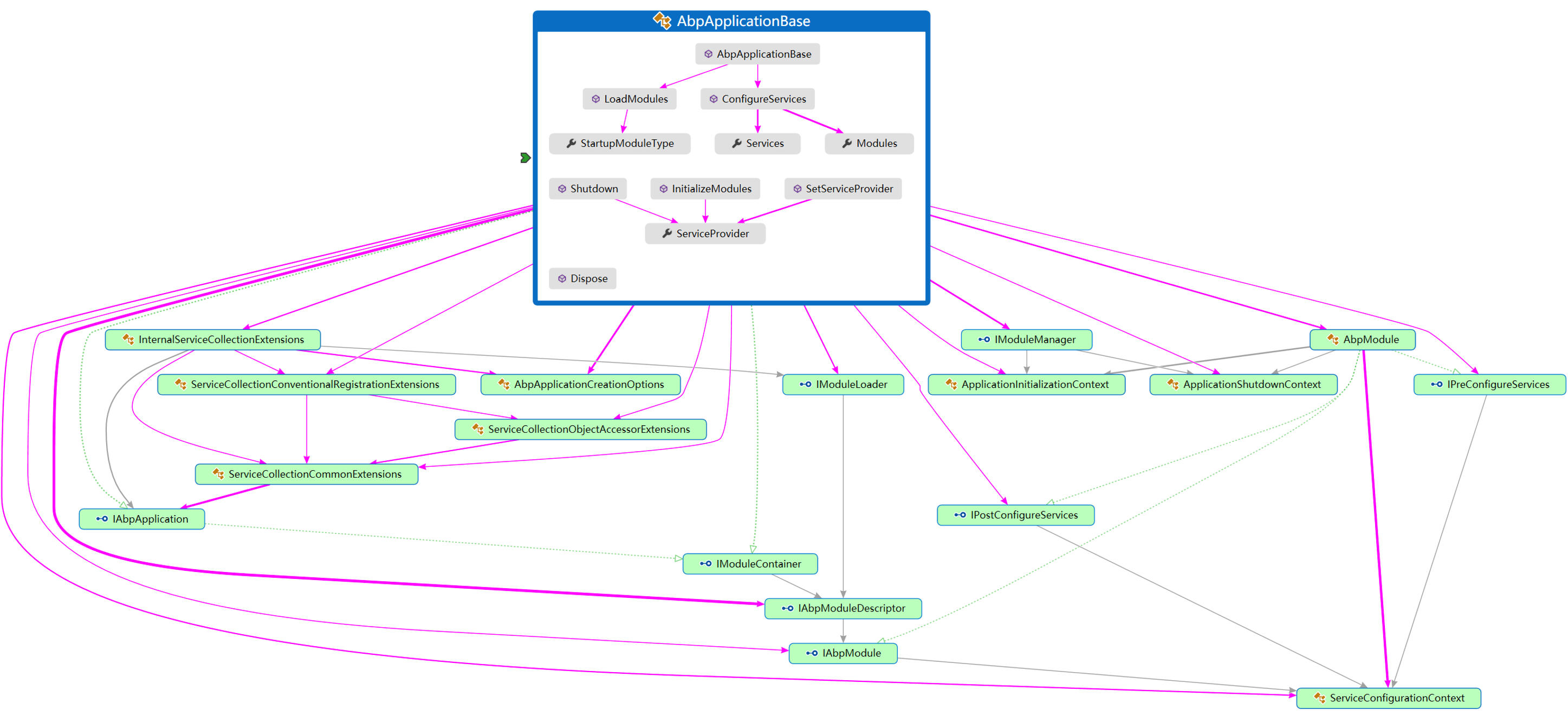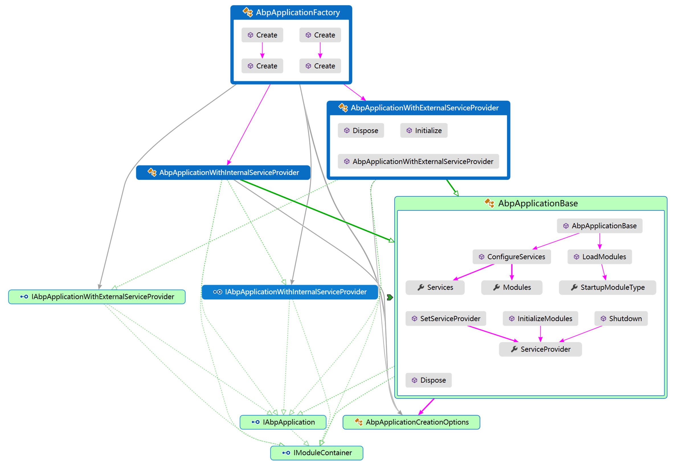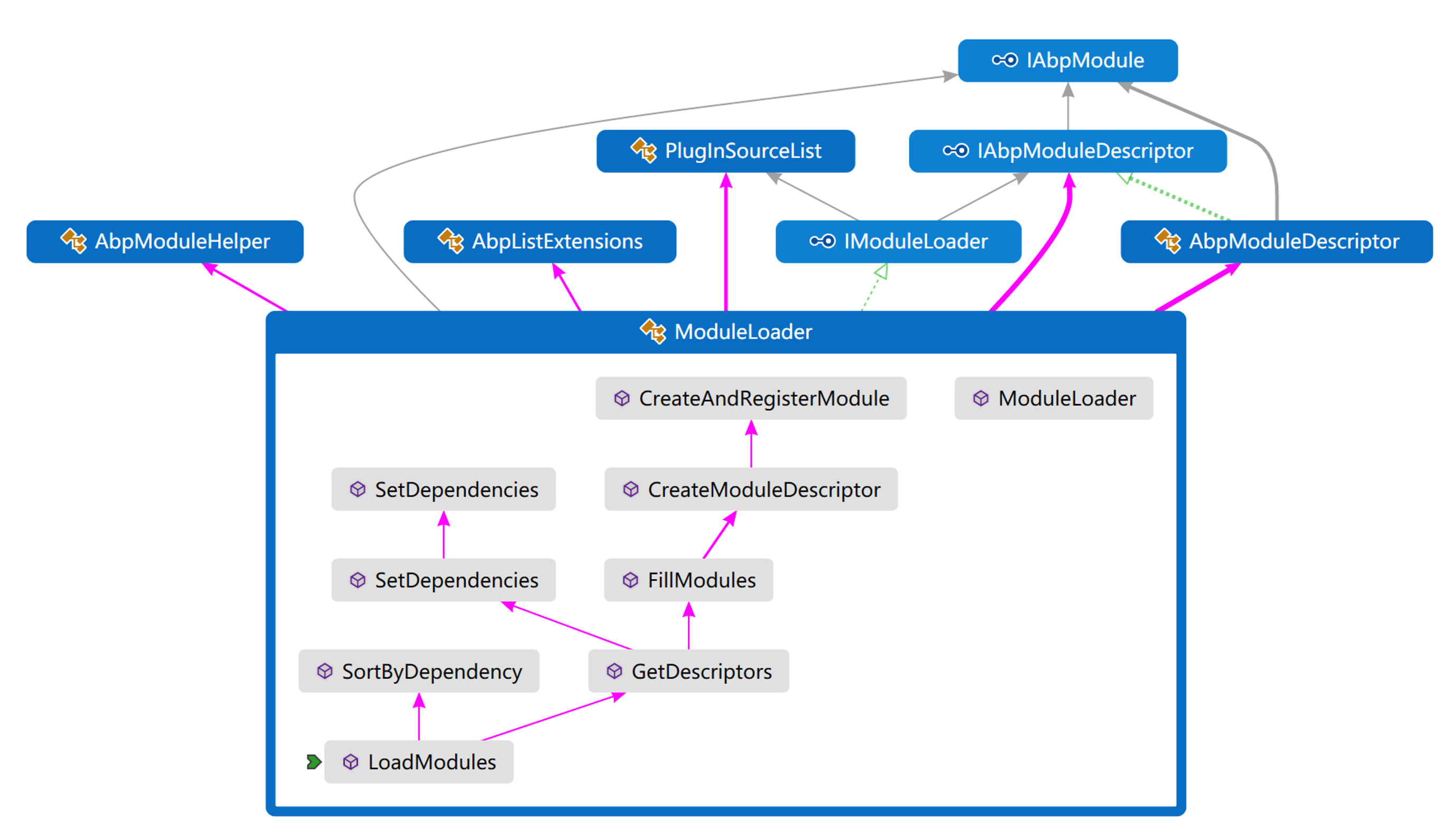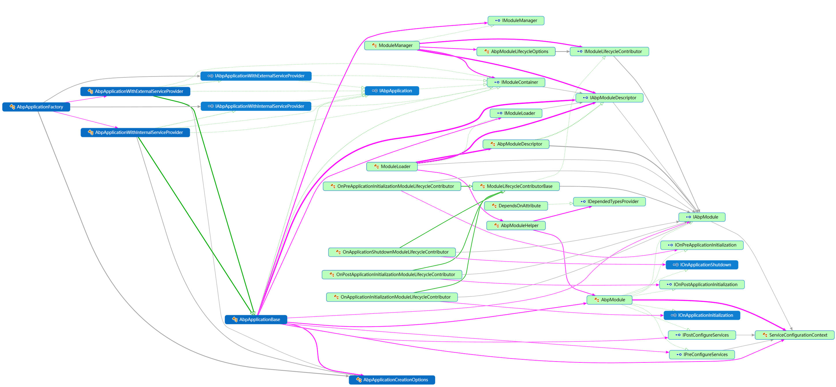 - IModuleLifecycleContributor对象最终组装在ModuleManager对象中,由AbpApplicationBase对象调用