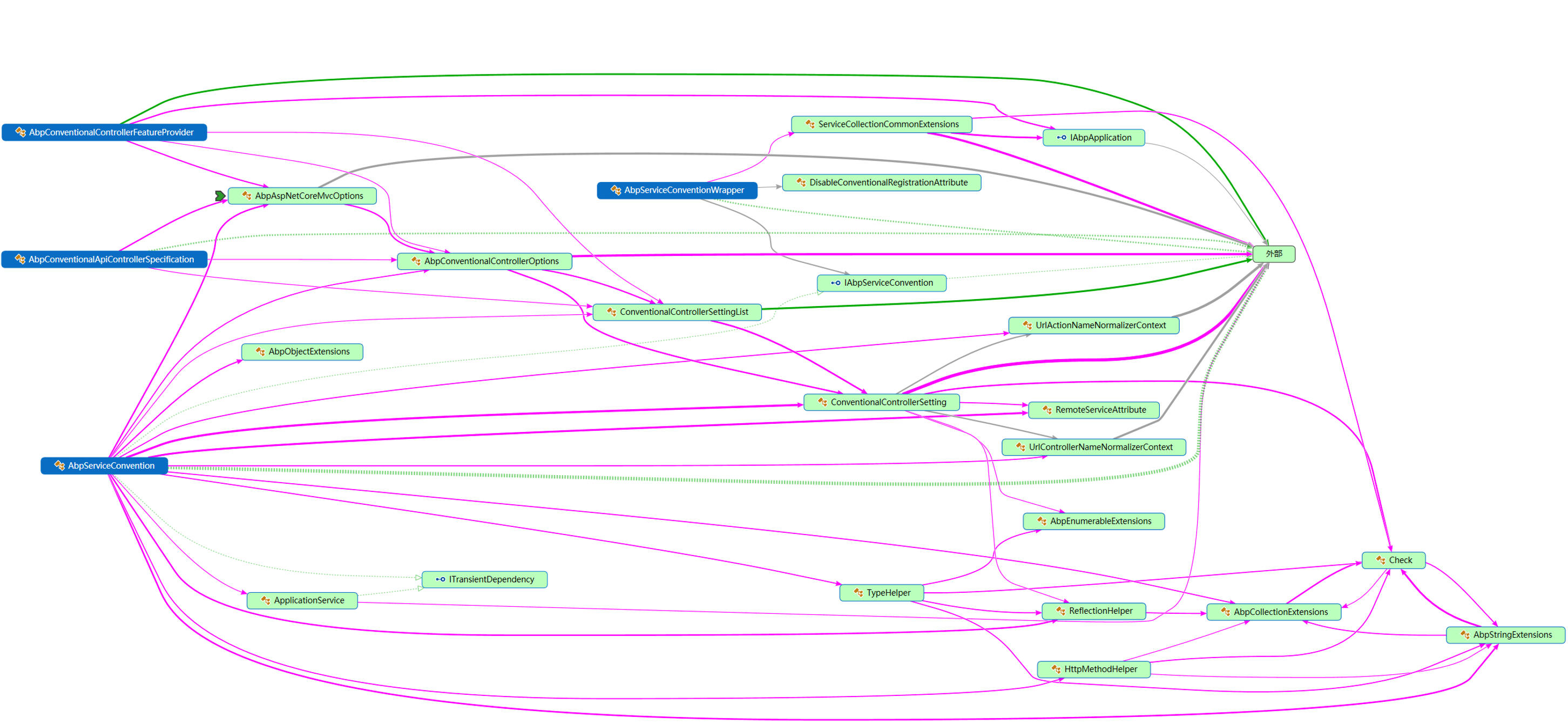 - 接口IAbpServiceConvention是一个ASP.NET Core框架的约定,它会通过包装器AbpServiceConventionWrapper,将规则延迟加载到配置中去。