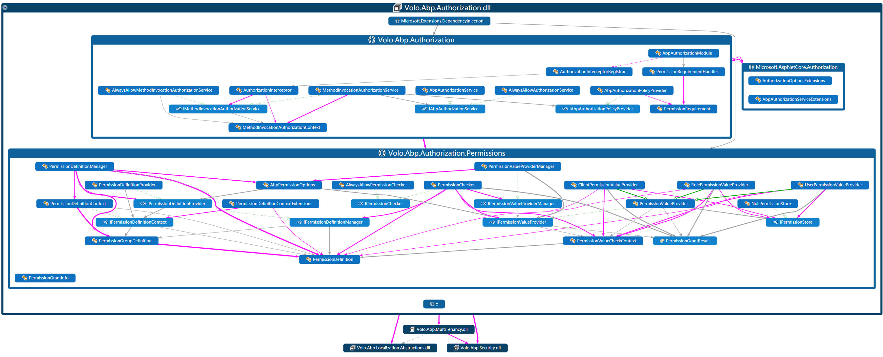 PermissionManager 在 ABP vNext 框架中是一个核心的单例服务,它并不直接用于“扩展”,而是作为权限系统的中枢,负责权限的定义、存储和管理。它协调整个权限系统的生命周期,确保所有模块定义的权限能够被正确收集、组织,并提供给授权系统使用。