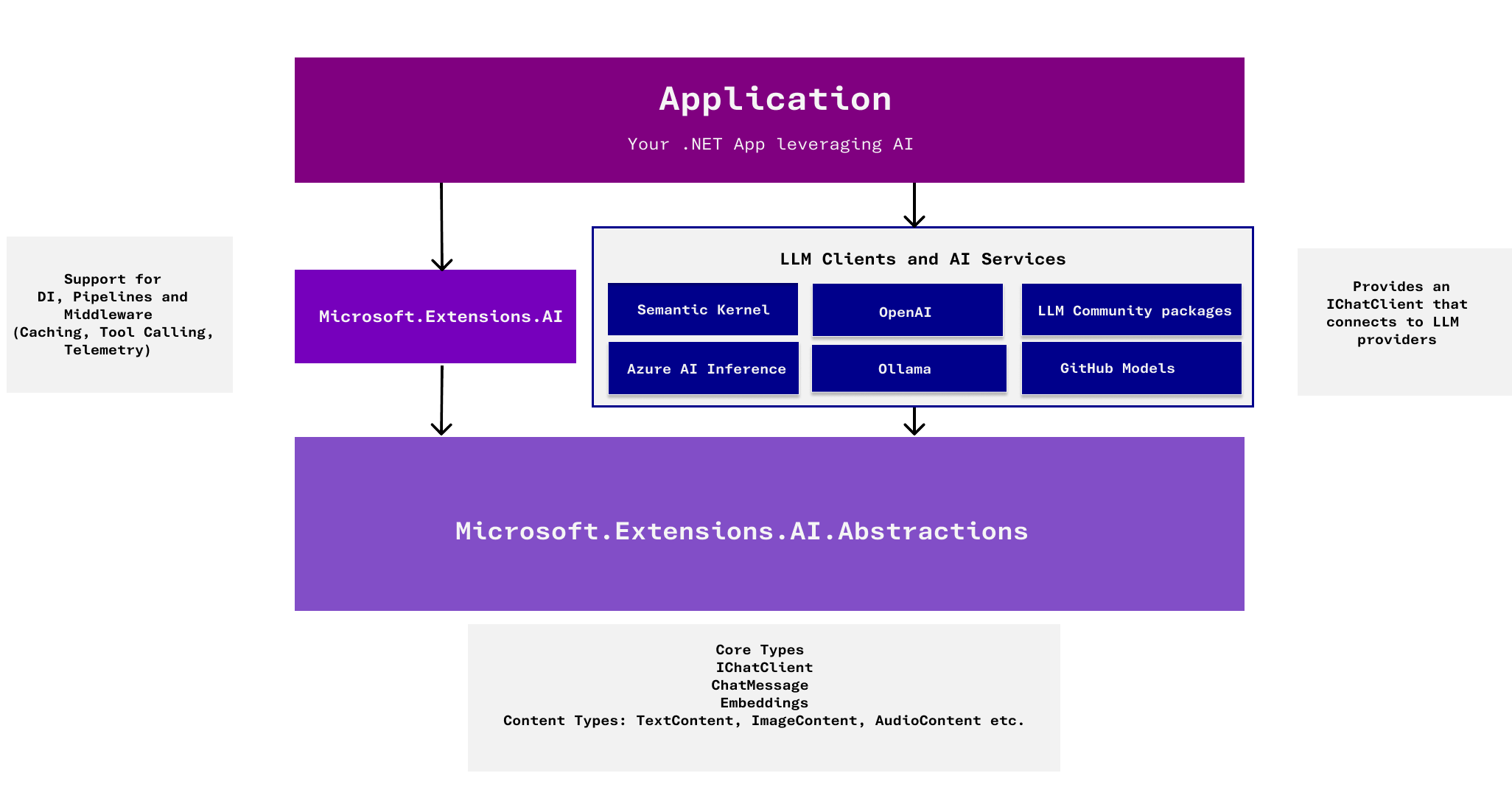 "Microsoft.Extensions.AI 为 .NET 提供统一 AI 抽象。",