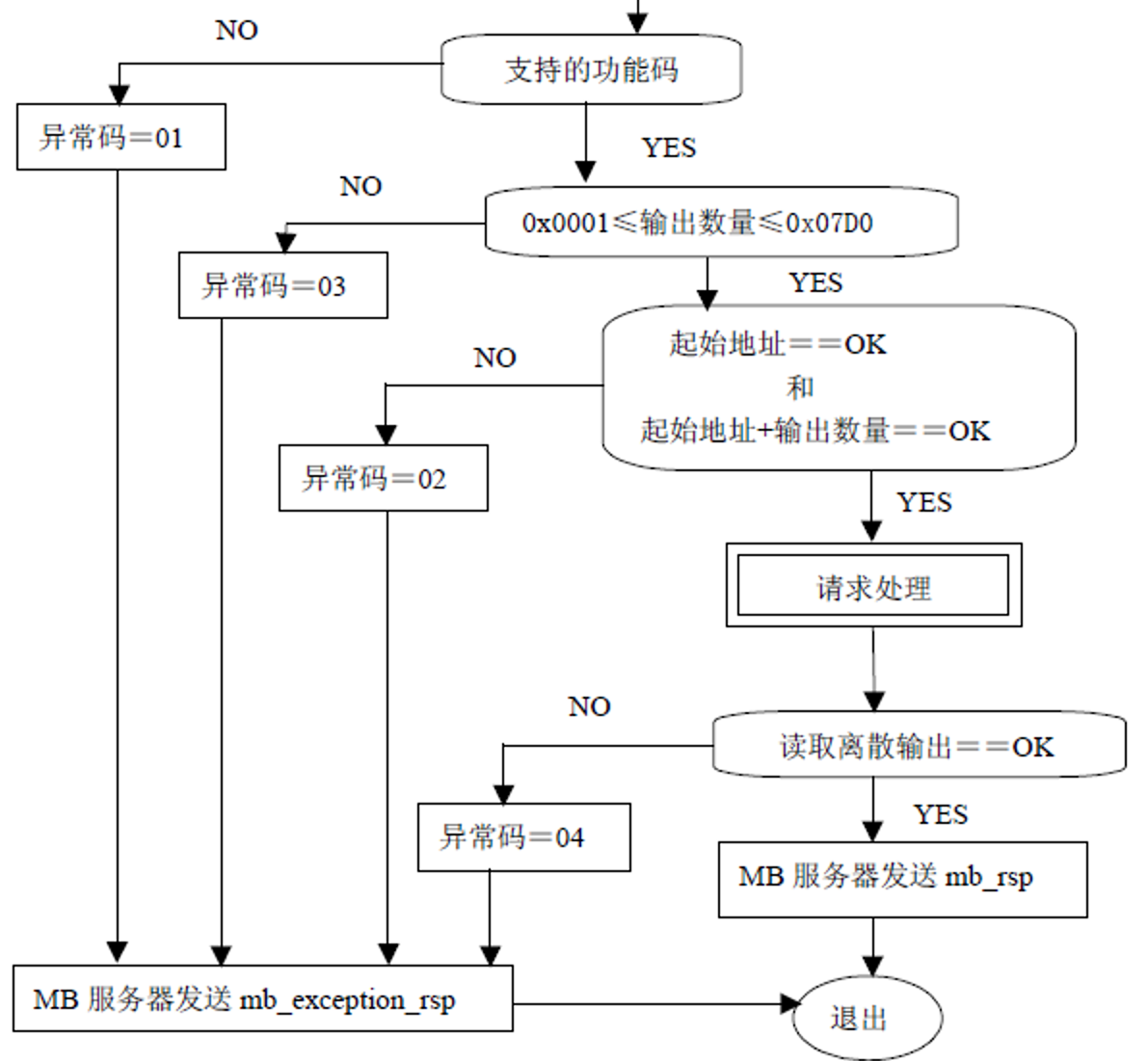 | 07 | 读取异常状态 | 取得8个内部线圈的通断状态,这8个线圈的地址由控制器决定,用户逻辑可以将这些线圈定义,以说明从机状态,短报文适宜于迅速读取状态 |