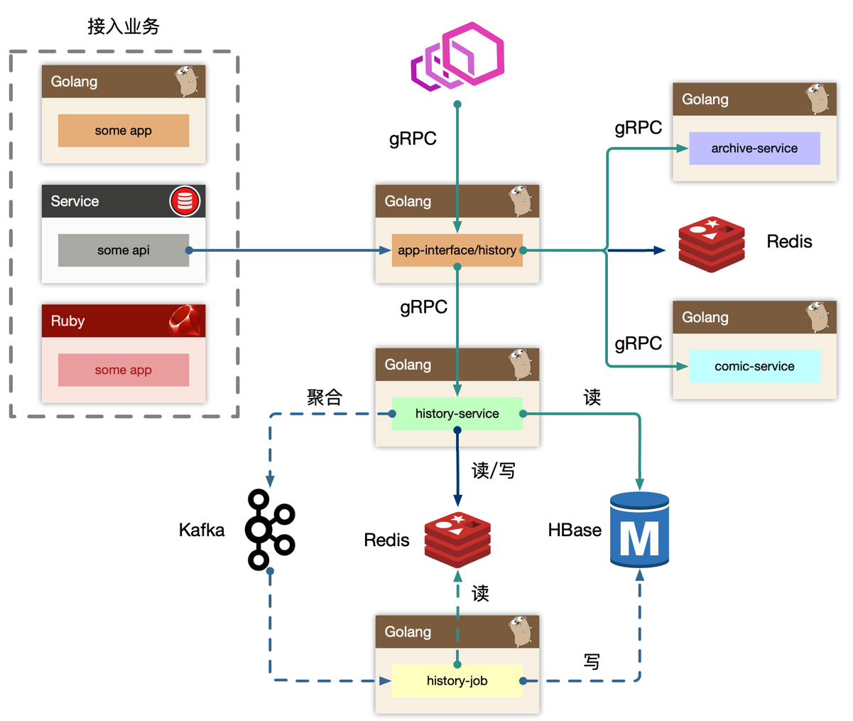 Upstream(some-app,some-api):整个历史服务还会被一些外部 gRPC 服务所依赖,所以 history 还充当了内网的 gRPC Provider,这些上游服务,使用历史服务的写接口,把自己业务的数据进行持久化。