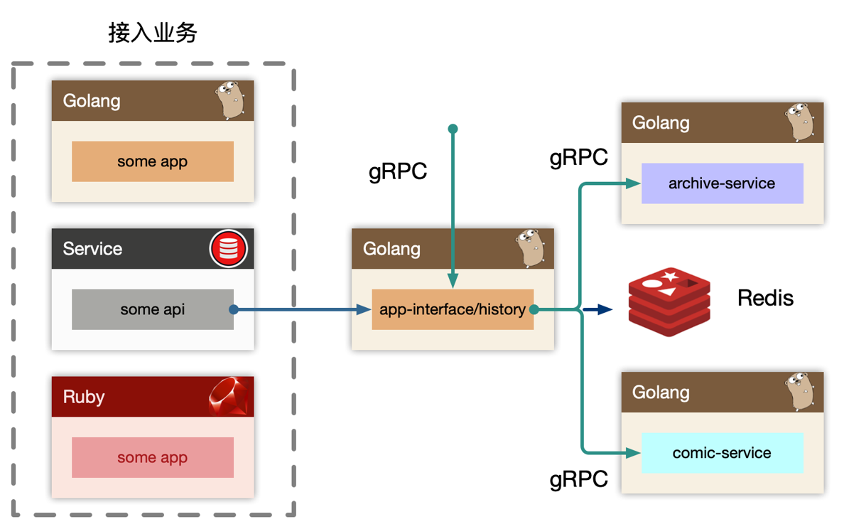 history 作为 BFF,对用户端提供统一的用户记录记录入口接口,同时也对内提供 gRPC 写入历史接口。如果业务场景中不存在统一的用户入口访问历史记录,可以去掉 BFF 层,直接使用 history-service 提供读接口,这样需要每个业务方自己实现自己的数据组装。