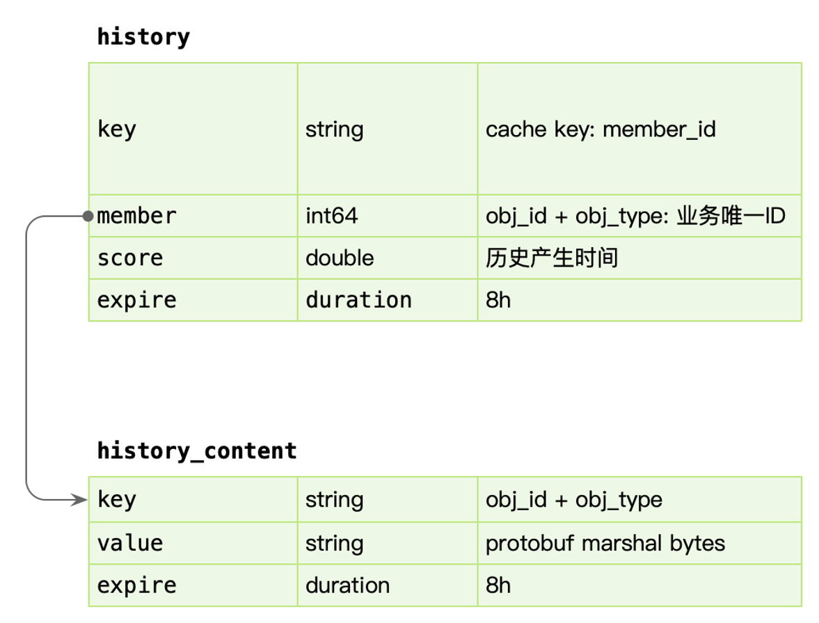 - 数据写入:每次产生的历史数据,需要立马更新 redis,使用 sorted set 基于时间排序的列表,member 为业务 ID。同时存储一份数据到 redis string 中,使用 protobuf 序列化完整的数据内容。为了避免 redis 中单个用户数据无限增长,需要超过一定量后对数据进行截断。