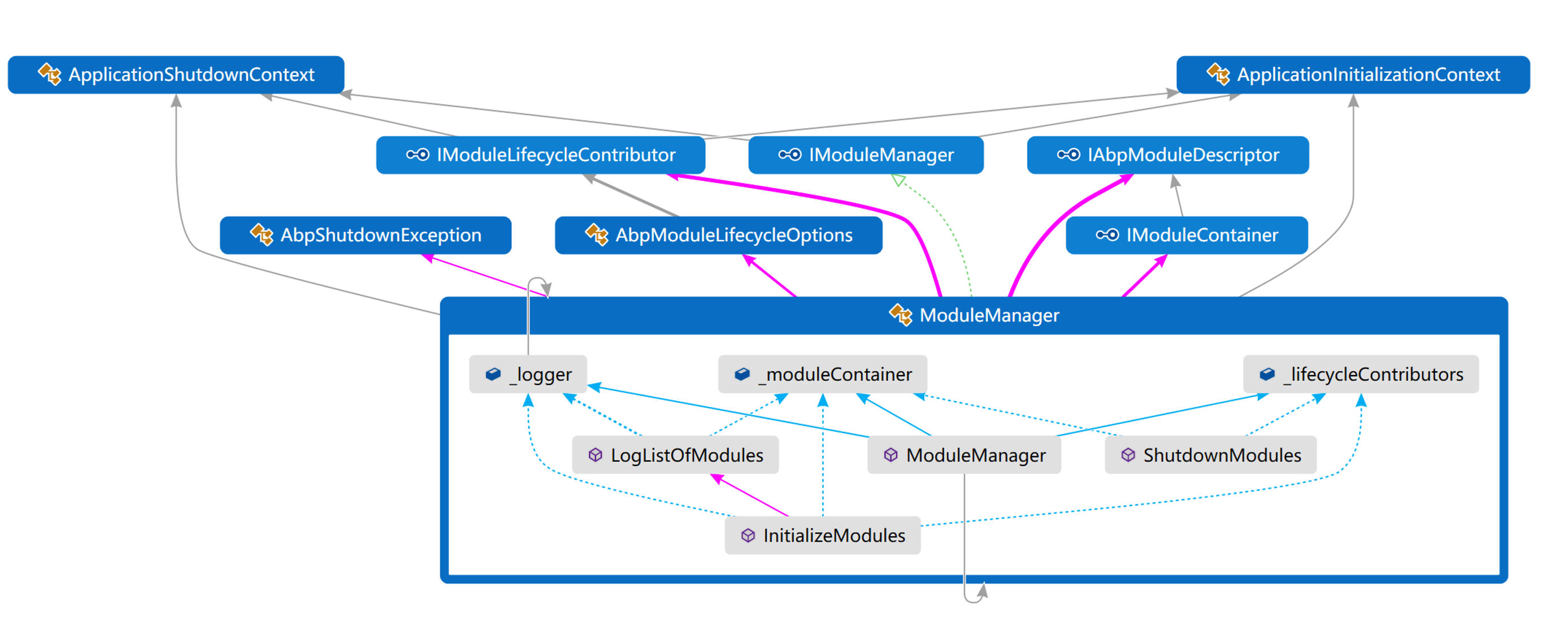 - IModuleLifecycleContributor对象最终组装在ModuleManager对象中,由AbpApplicationBase对象调用