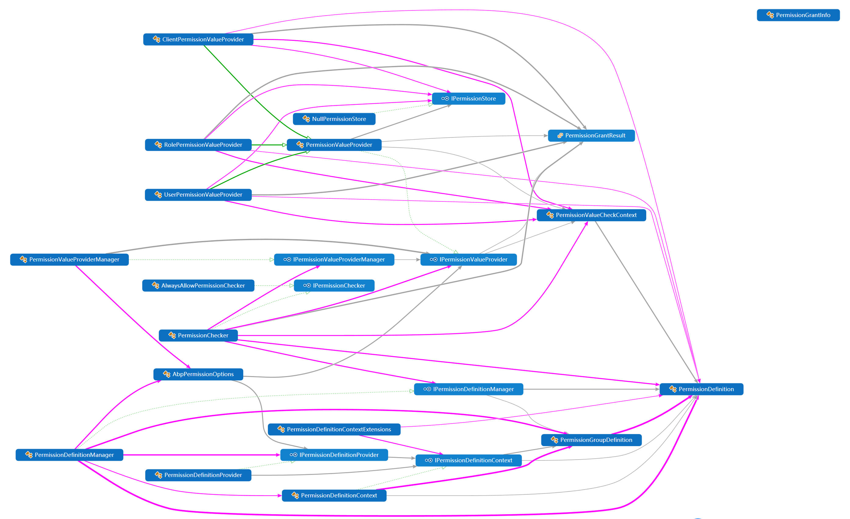 PermissionManager 实现了 IPermissionManager 接口,并继承自 PermissionDefinitionContextBase 类