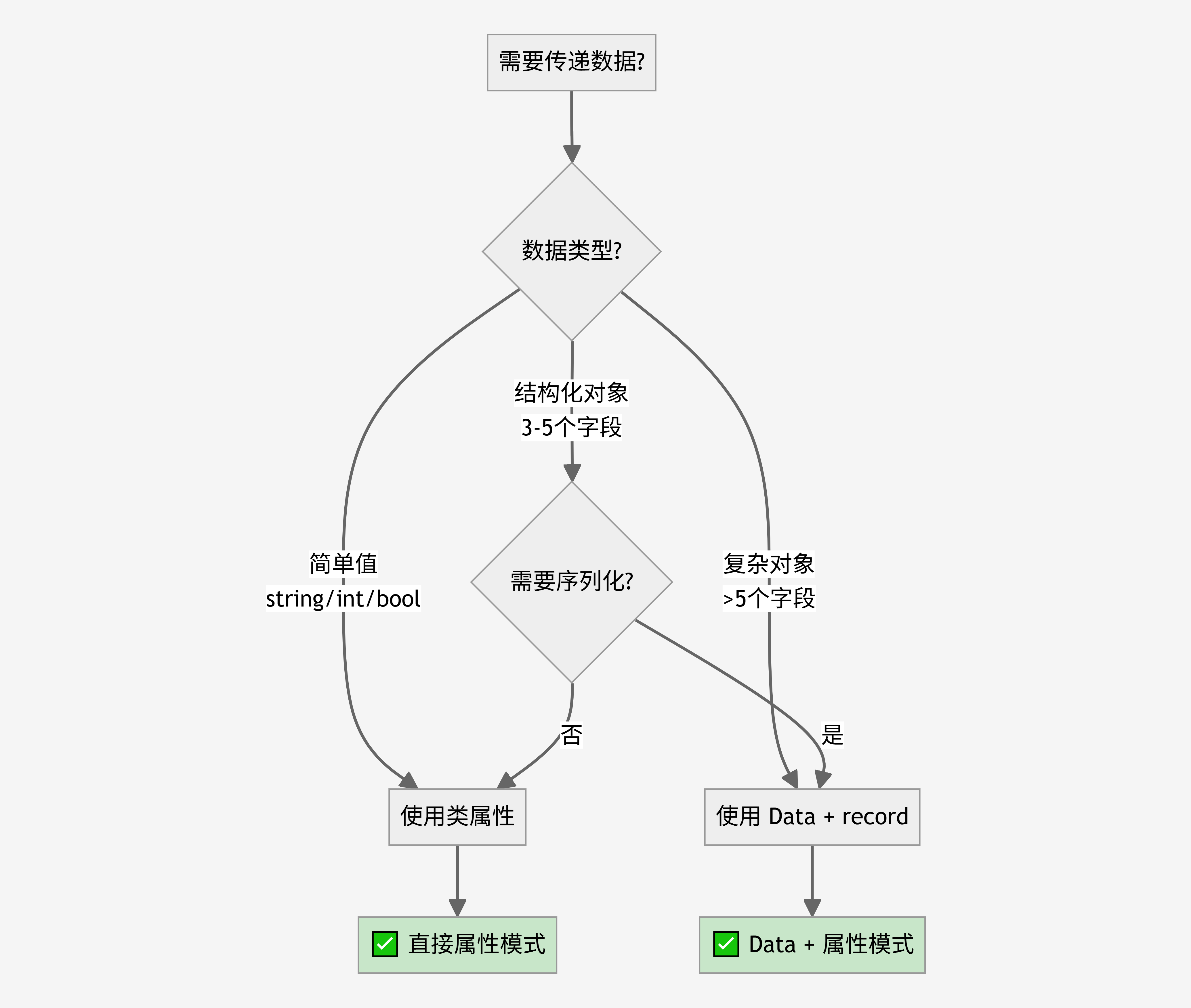 | 数据简单(<5个字段) | 模式 1 | 类型安全,直接访问属性 |